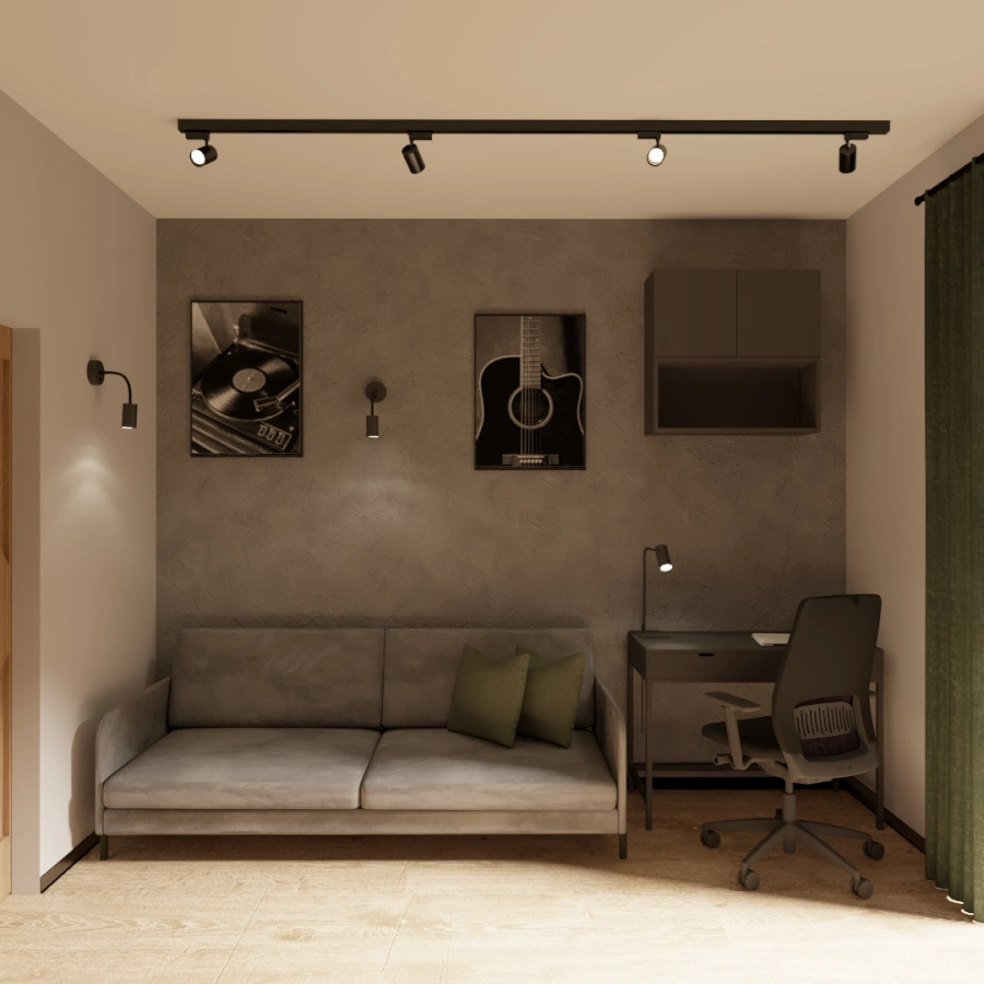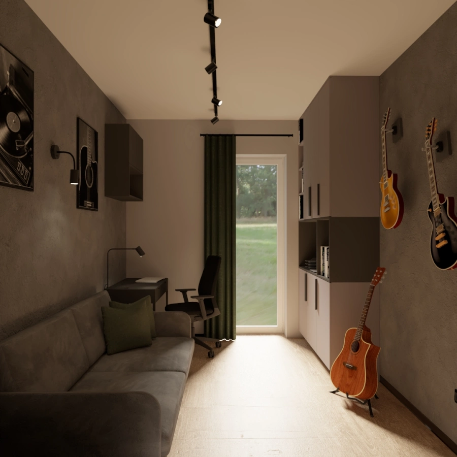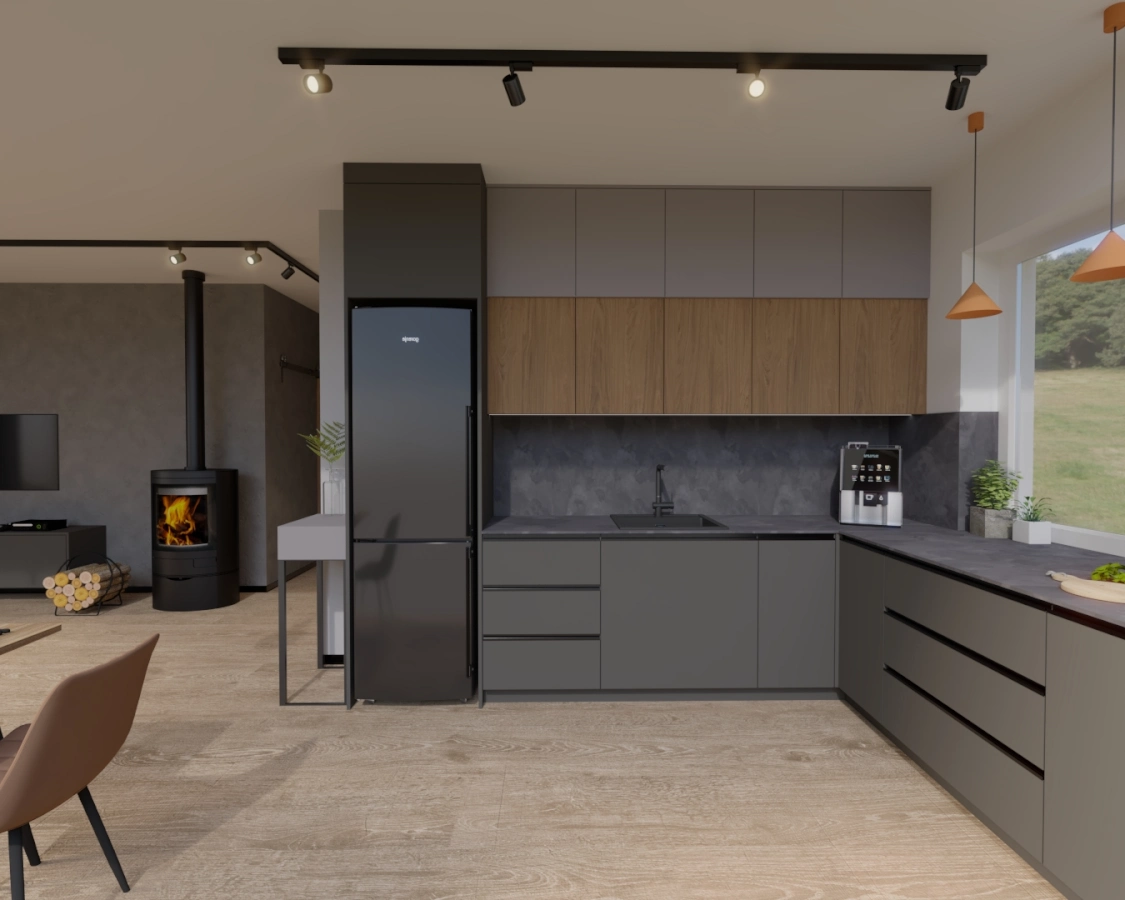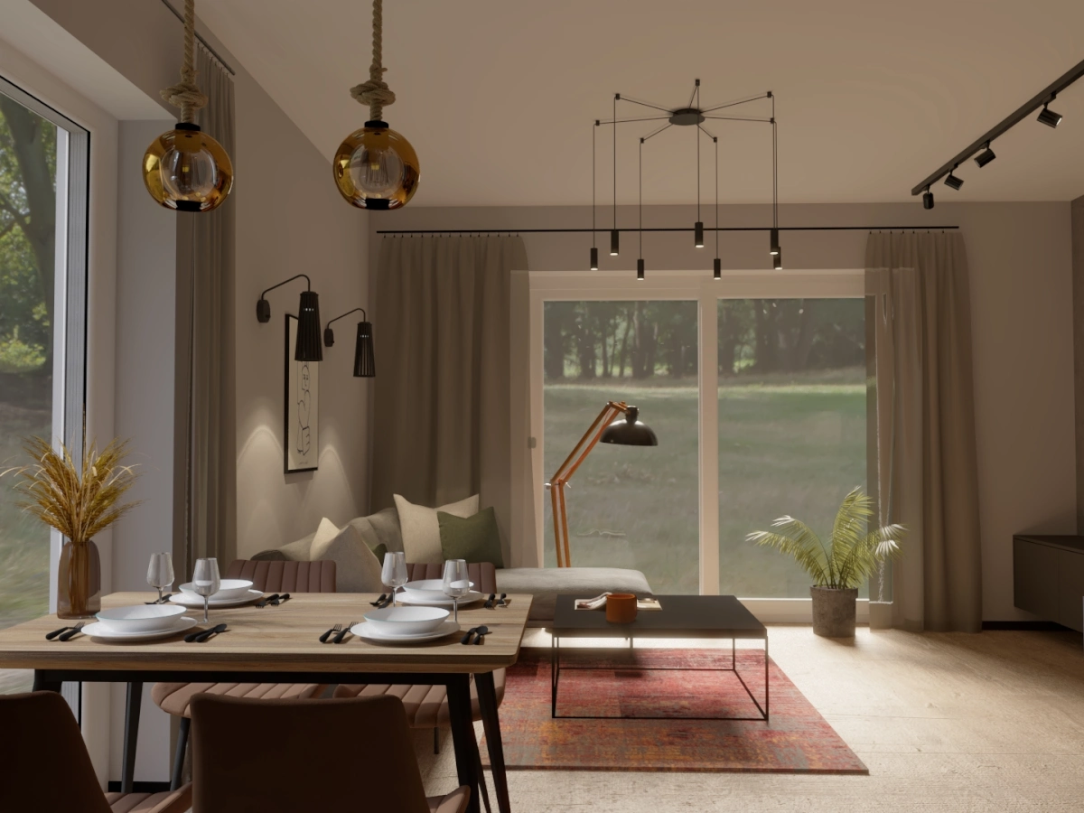 Projekt wnętrza niewielkiego domu szkieletowego w pobliżu Kampinoskiego Parku Narodowego. Ciepła paleta barw inspirowana naturą tworzy przytulną przestrzeń do życia i relaksu.