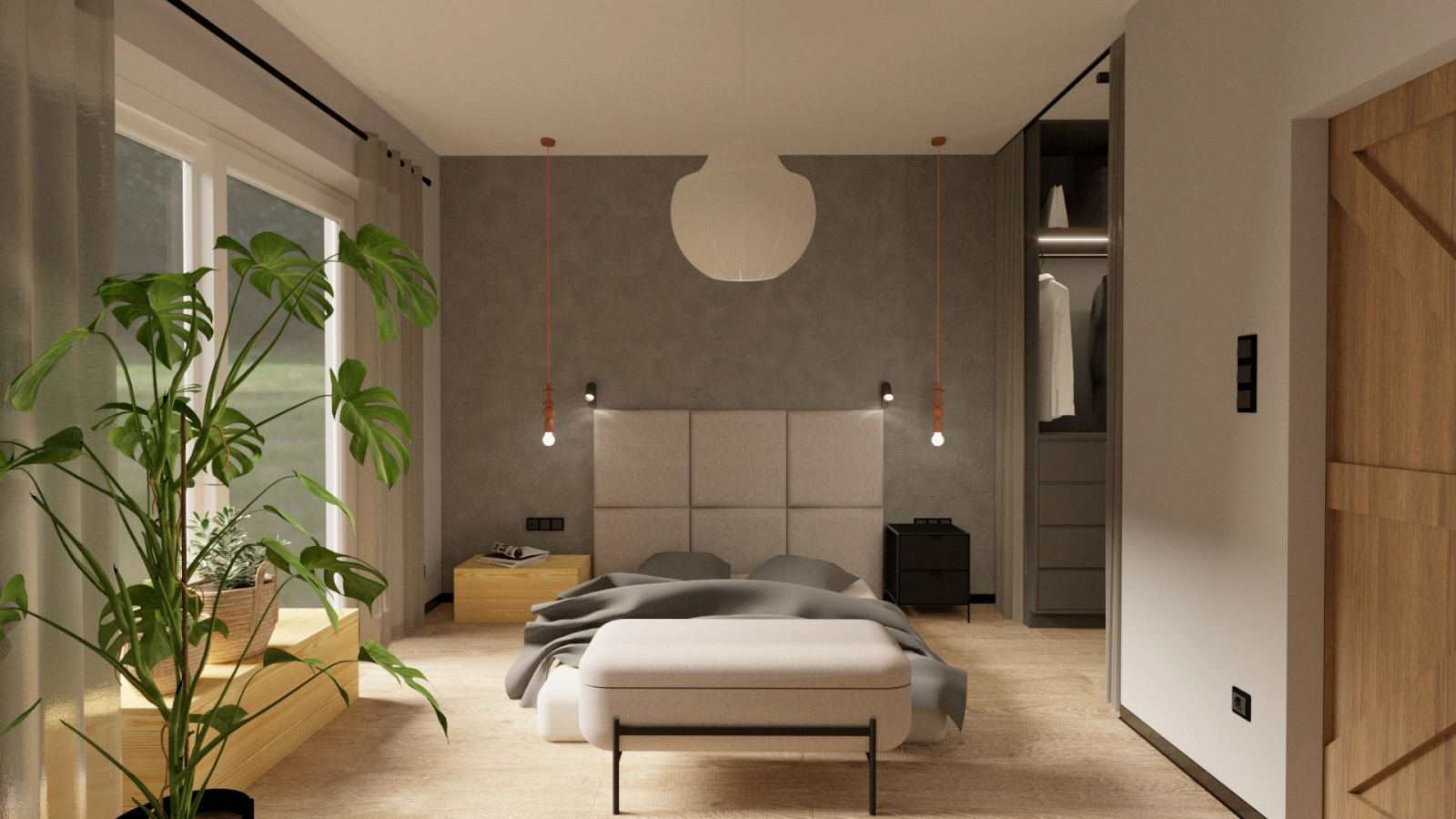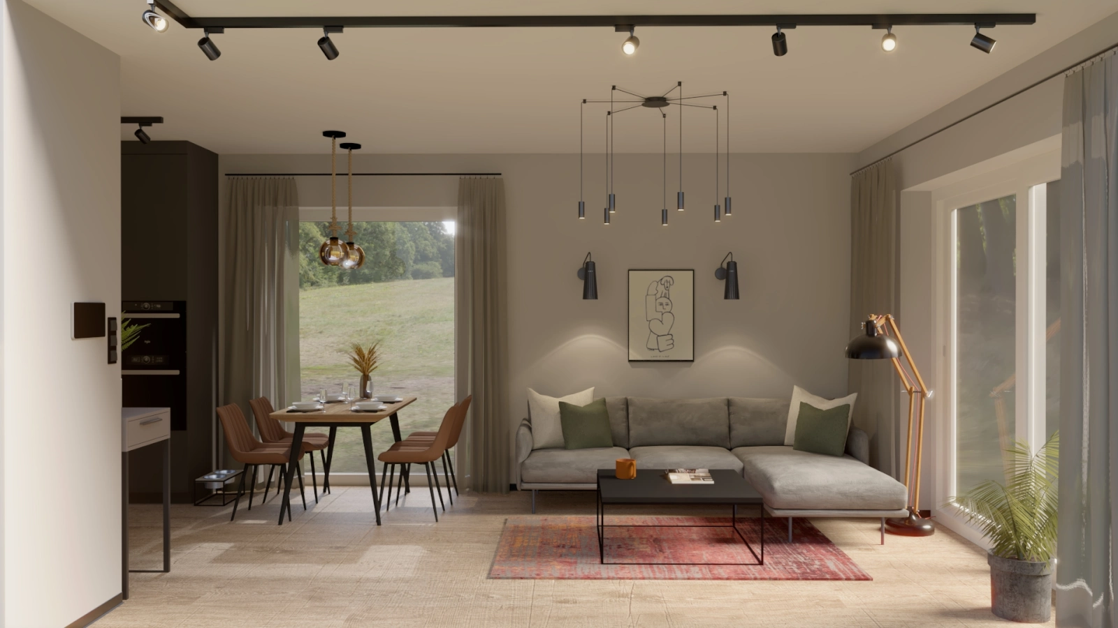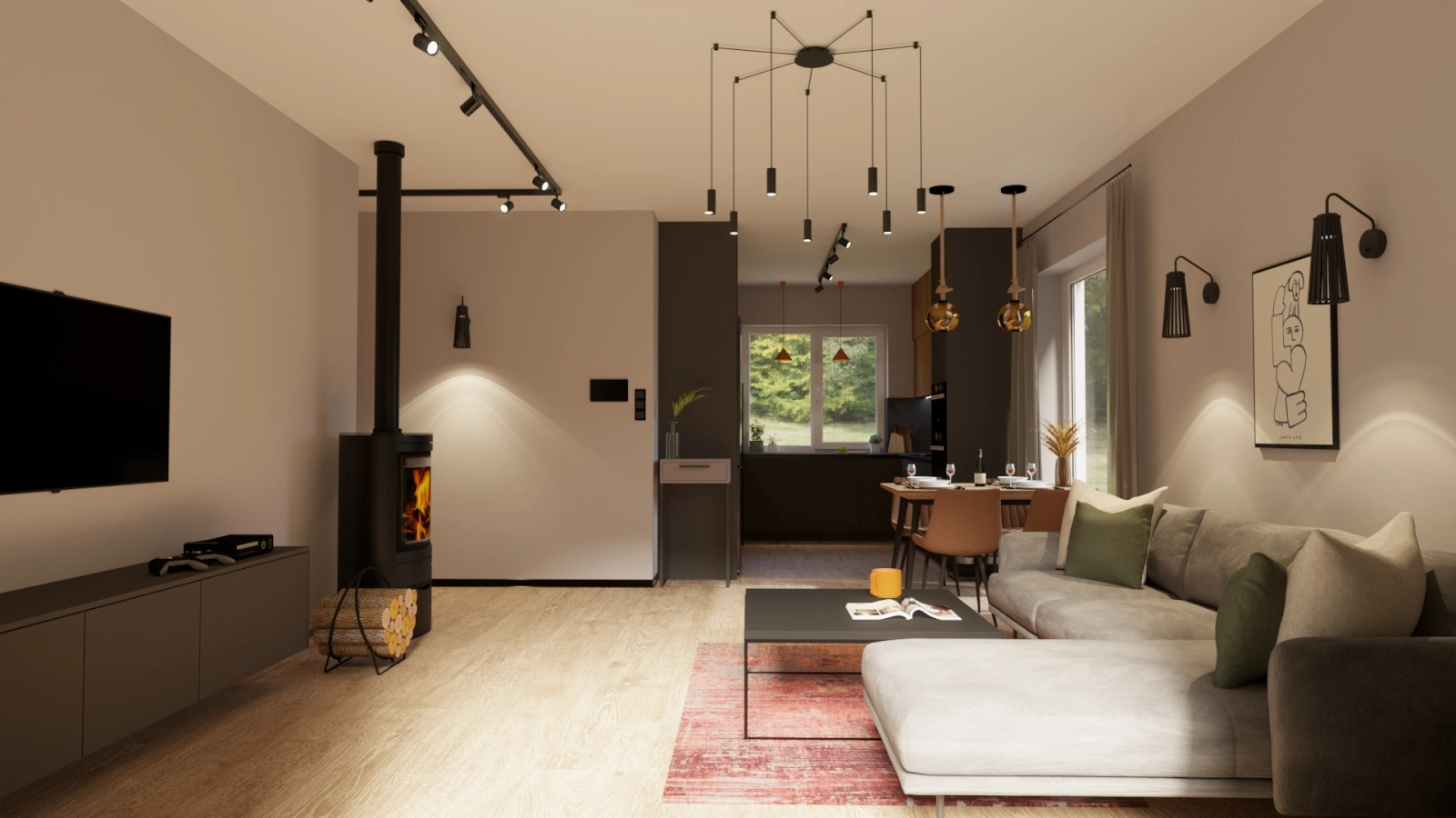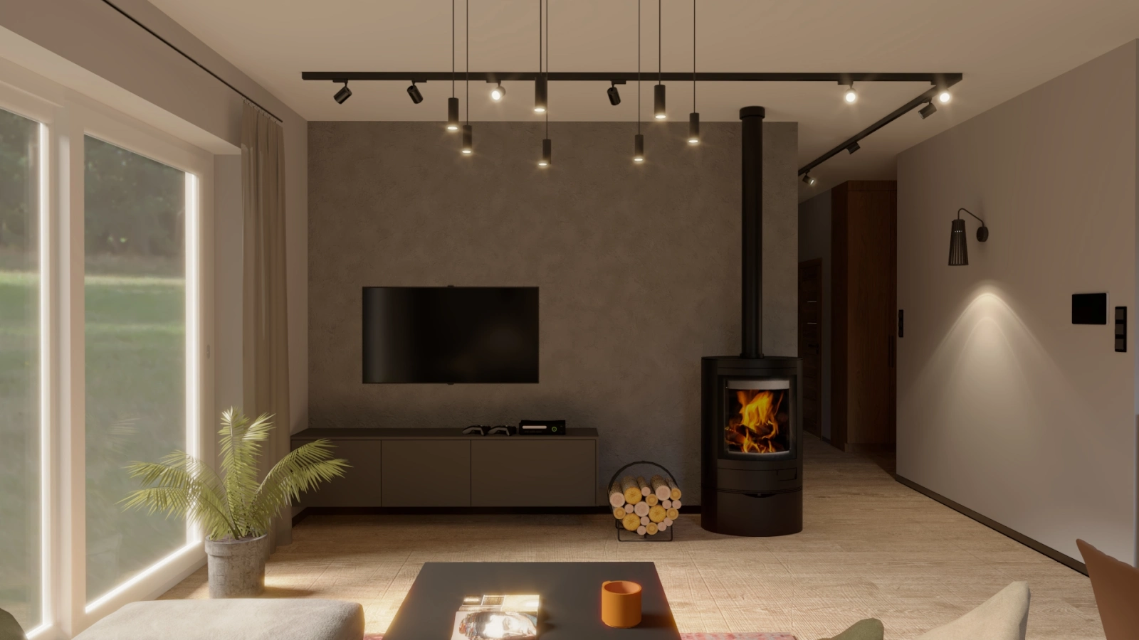 Projekt wnętrza niewielkiego domu szkieletowego w pobliżu Kampinoskiego Parku Narodowego. Ciepła paleta barw inspirowana naturą tworzy przytulną przestrzeń do życia i relaksu.