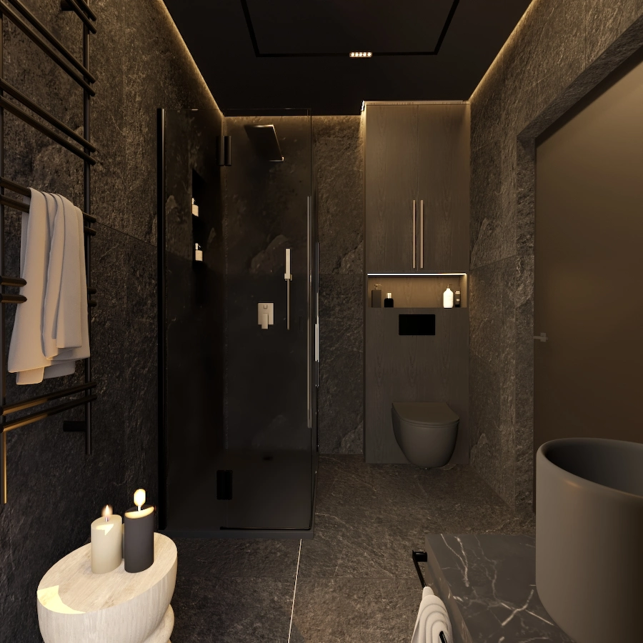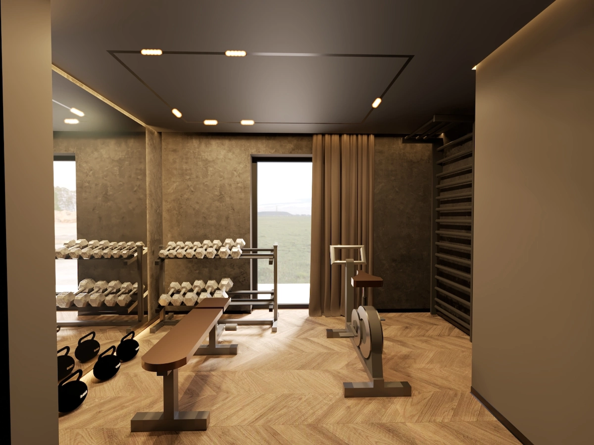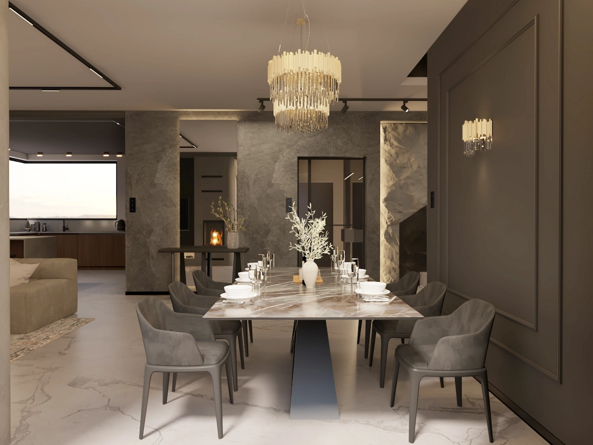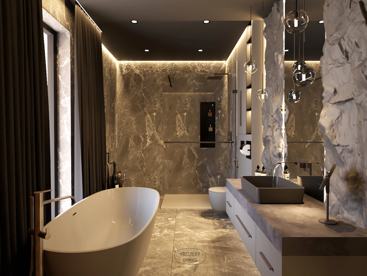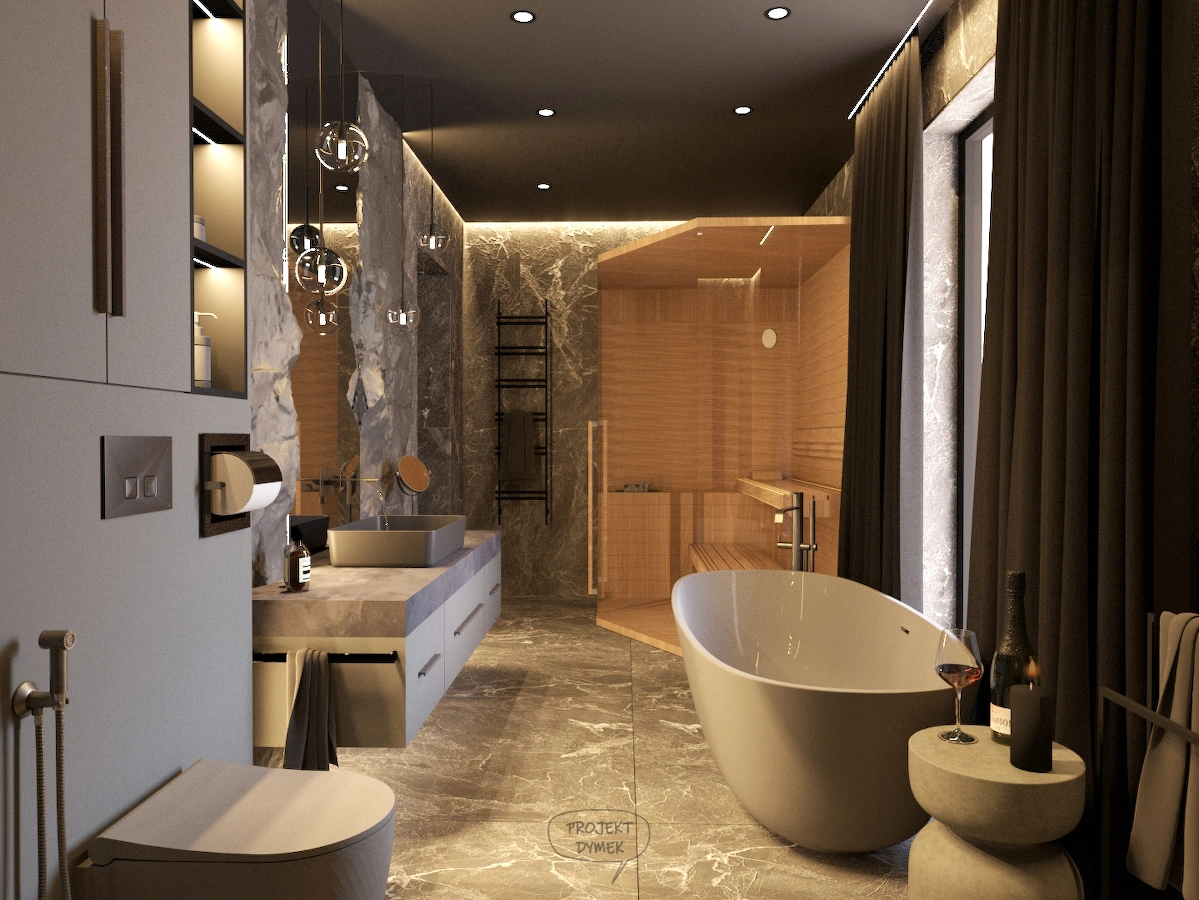 Projekt obejmuje pełną aranżację wnętrz domu jednorodzinnego – od reprezentacyjnej strefy dziennej, przez relaksującą sypialnię master z prywatną łazienką i sauną, aż po minimalistyczny pokój gościnny. Dominują szlachetne odcienie beżu, grafitu i czerni, uzupełnione naturalnym drewnem i dekoracyjnym kamieniem. Całość dopełniają subtelne detale oświetleniowe i wysokiej klasy wyposażenie, tworząc elegancką, ale funkcjonalną przestrzeń do życia.