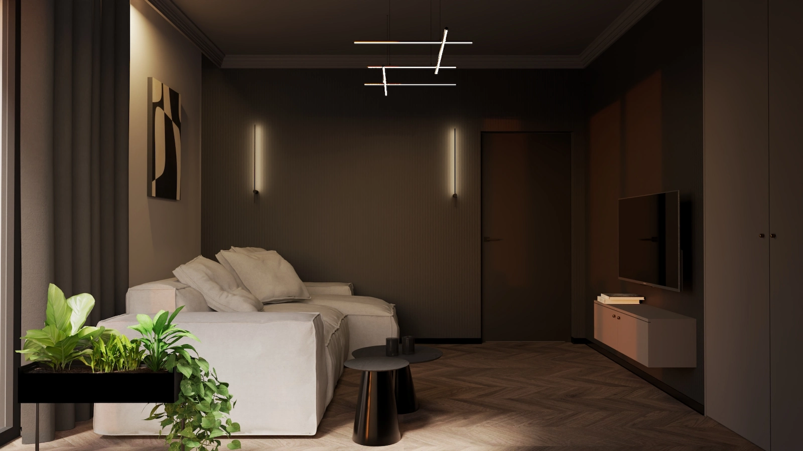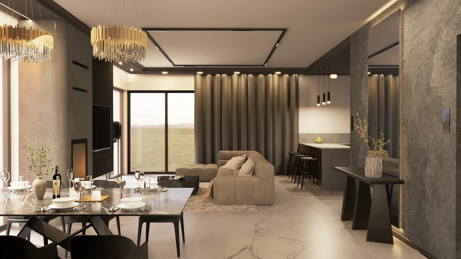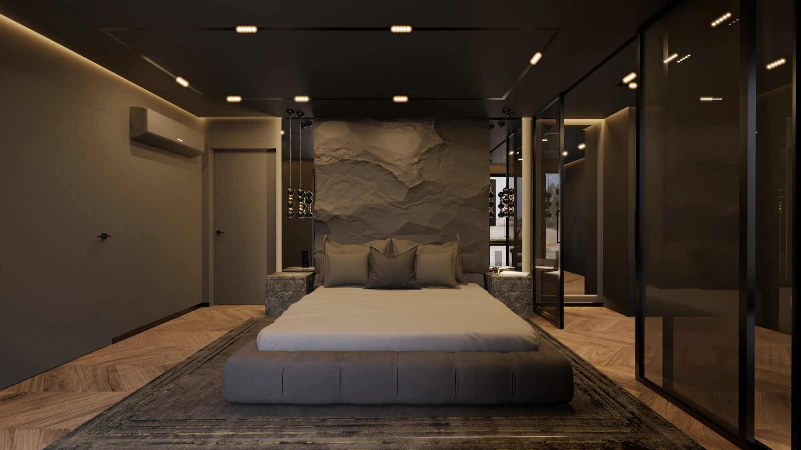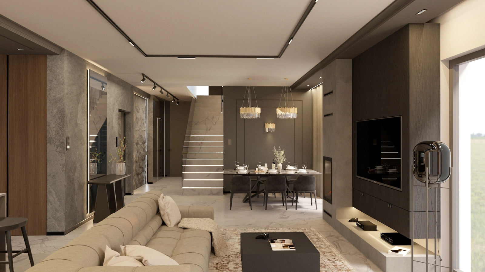Projekt obejmuje pełną aranżację wnętrz domu jednorodzinnego – od reprezentacyjnej strefy dziennej, przez relaksującą sypialnię master z prywatną łazienką i sauną, aż po minimalistyczny pokój gościnny. Dominują szlachetne odcienie beżu, grafitu i czerni, uzupełnione naturalnym drewnem i dekoracyjnym kamieniem. Całość dopełniają subtelne detale oświetleniowe i wysokiej klasy wyposażenie, tworząc elegancką, ale funkcjonalną przestrzeń do życia.