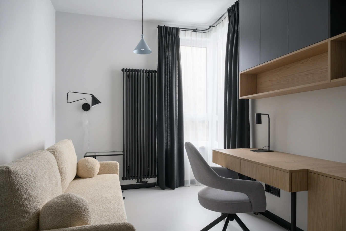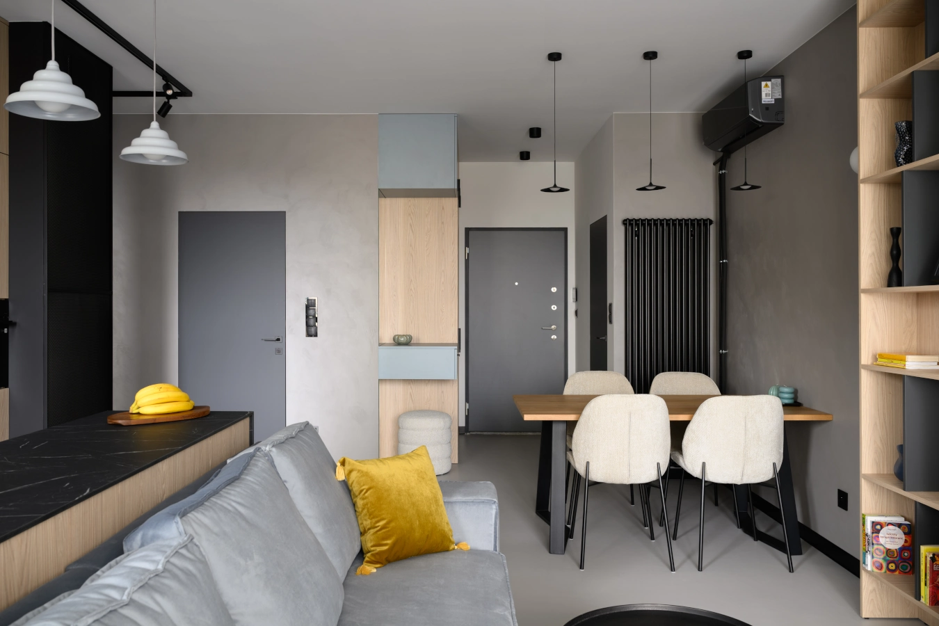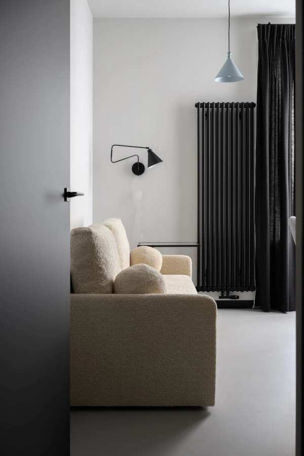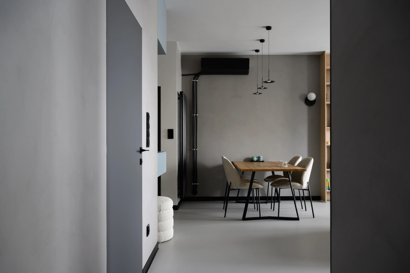Mikrocement na podłogach i ścianach tworzy minimalistyczne tło, które eksponuje detale: industrialne grzejniki, czarne szynoprzewody i meble o prostych, eleganckichliniach.