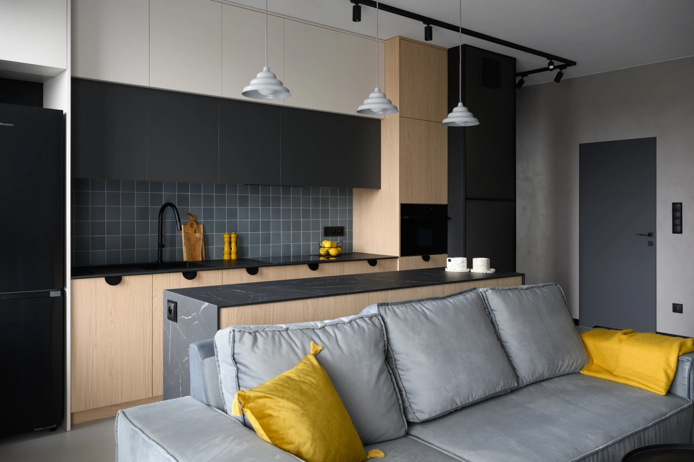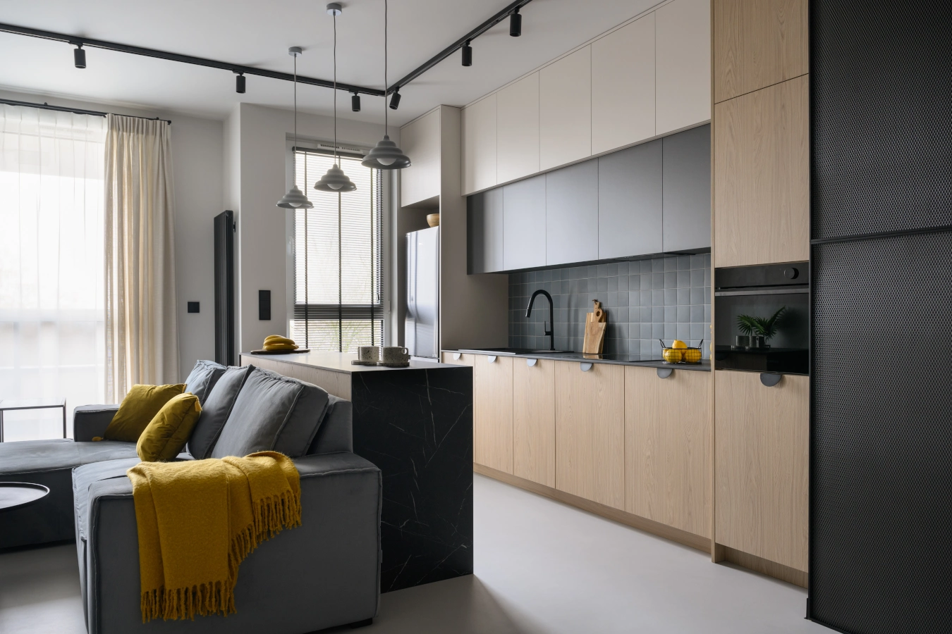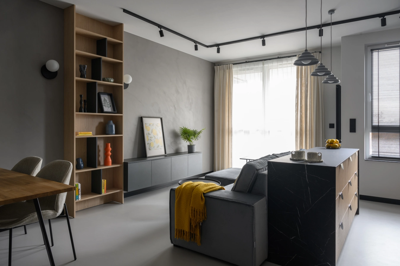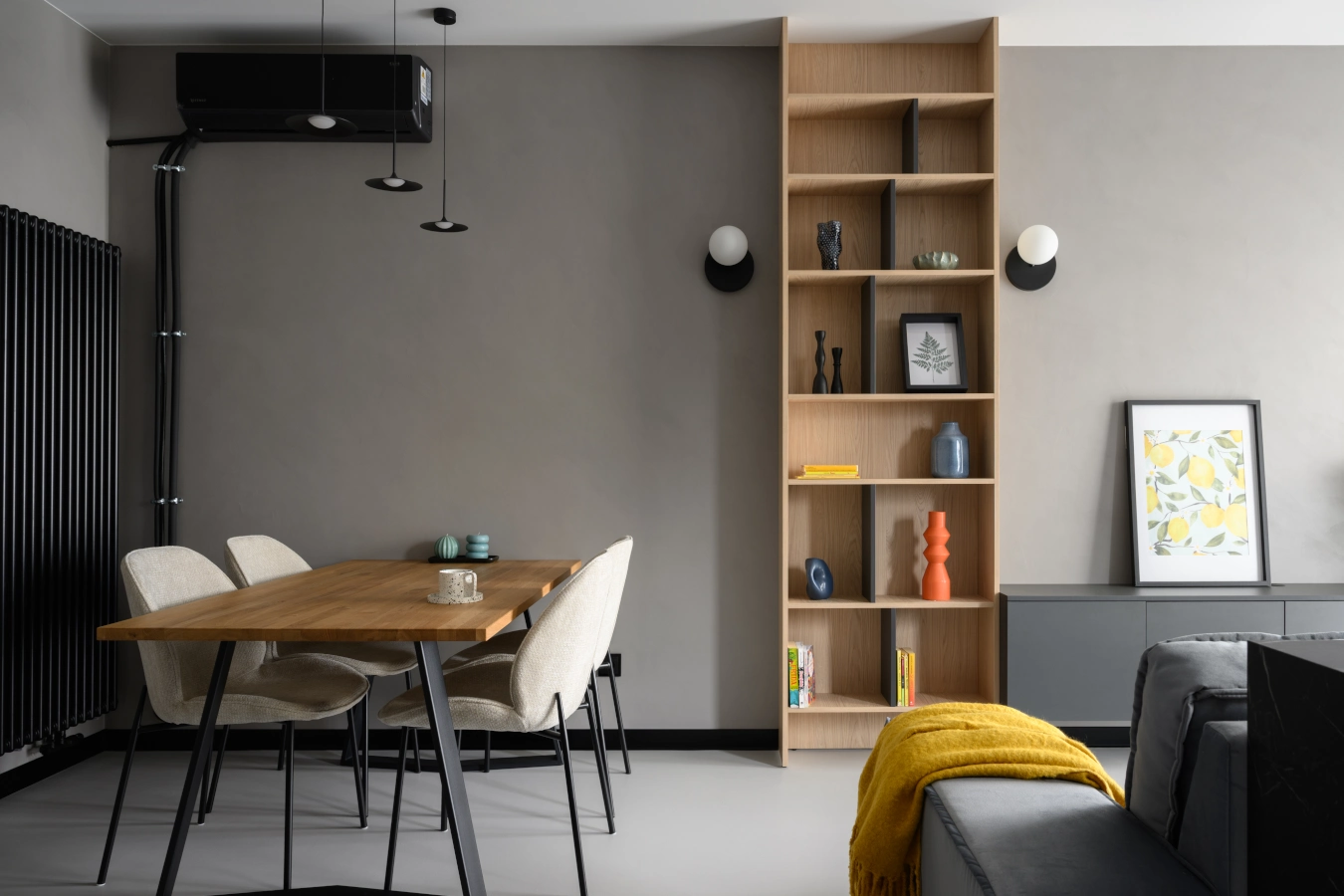 Mikrocement na podłogach i ścianach tworzy minimalistyczne tło, które eksponuje detale: industrialne grzejniki, czarne szynoprzewody i meble o prostych, eleganckichliniach.