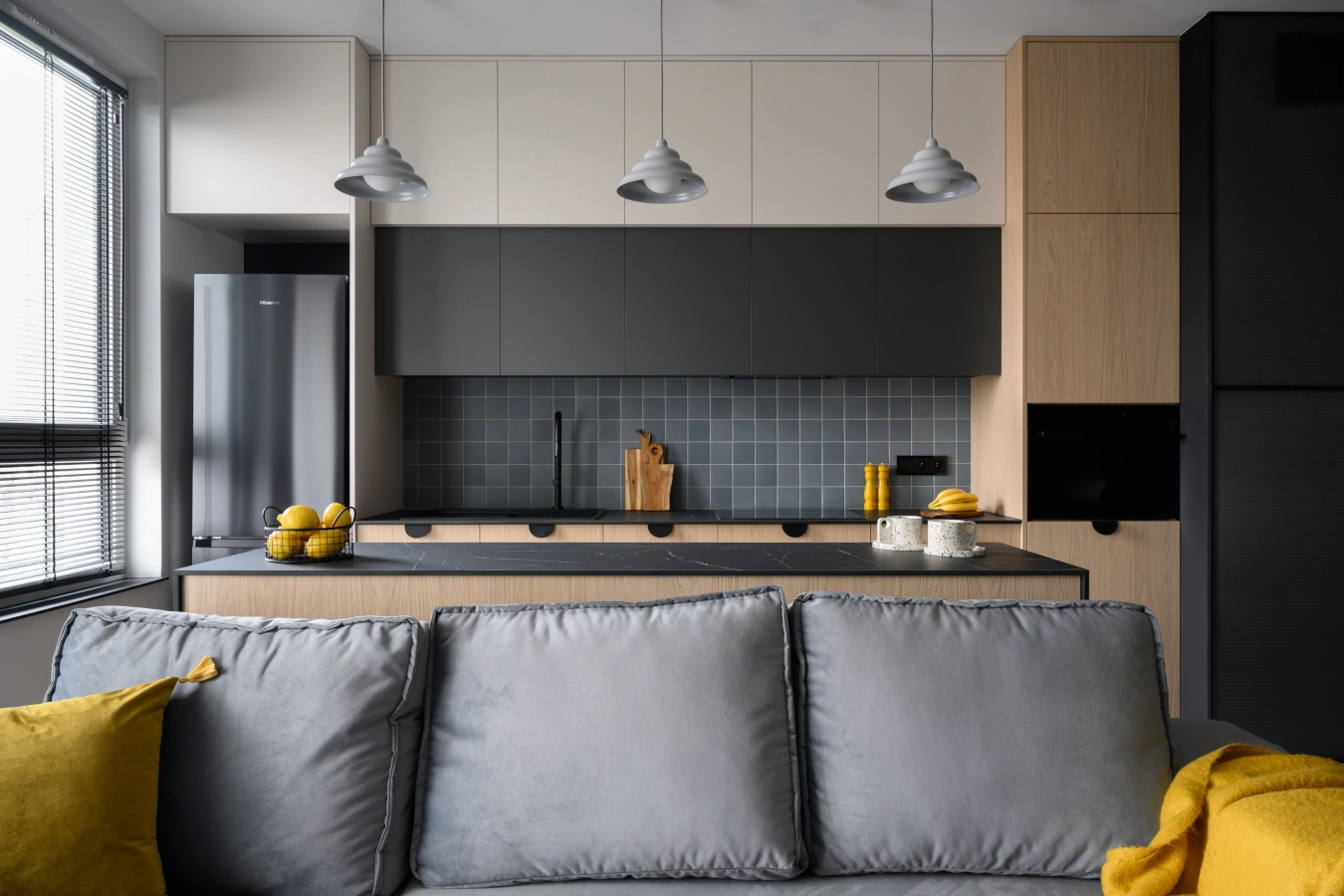 Wszystko zostało zaplanowane tak, by zachować przestrzeń, ale nie rezygnować z wyrazu. Przygaszony błękit przewija się przez wszystkie pomieszczenia, wprowadzając spokój i spójność.
